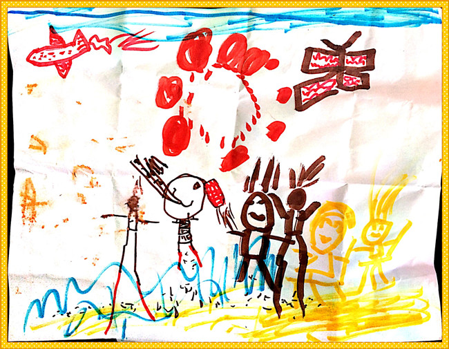 蓝色是湖水,天上有太阳、飞机和蝴蝶。棕色的是同行的Steven和Alan哥哥,远远的高个子是哥哥Quincy,女孩是Melissa自己,坐着的是妈妈们。
