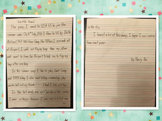 10岁的Harry独自一人从上海飞到西雅图参加为期三周的寄宿夏令营。天然的木屋、有趣的吊床、友好的老师、可爱的同学,骑车、滑索、划船,每天的活动都充满乐趣和挑战!