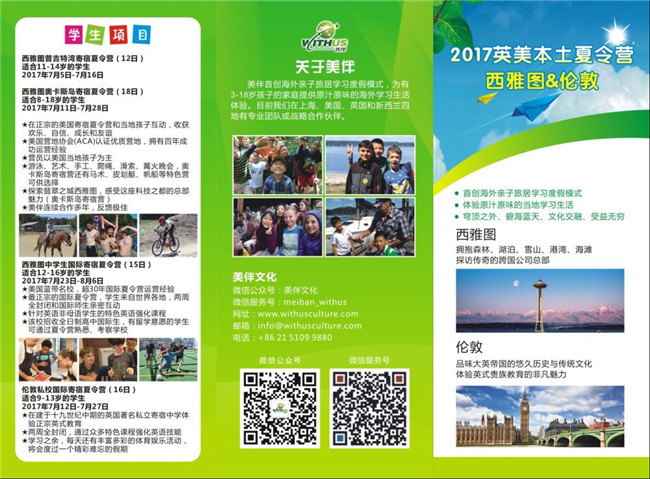 西雅图和伦敦的海外本土夏令营,都是美伴的经典项目。既有单飞的寄宿夏令营,也有亲子的走读夏令营。3-18岁的孩子都能找到适合自己的优质夏令营课程。还可将夏令营与众多精彩纷呈的旅游目的地相结合,美东/美西/黄石/阿拉斯加邮轮/圣胡安岛/加拿大落基山/苏格兰高地,会不会挑花眼?