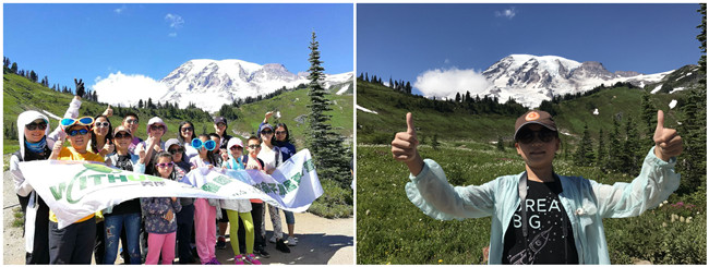 今天天气闷热,正希望凉快凉快,就来到了雷尼尔雪山。上了山啊,那真是漂亮。小路旁那绿树鲜花,五彩缤纷,五颜六色,路旁那绿树伸展着双臂,像是在欢迎我们呢。阳光撒在我身上,舒服极了!