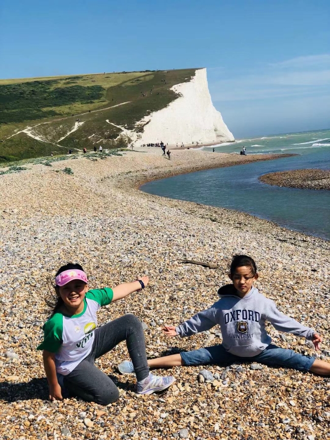 样的小石头;我们来到格林威治天文台看本初子午线,体验横跨东西半球的快乐;令我印象最深的是七姐妹国家公园的徒步,在湛蓝的天空下,羊儿们在一片片色彩斑斓的草原里悠闲的吃着草,真是令人心旷神怡啊!我们徒步了1个多小时,在精疲力尽之时终于看到了最著名的七座白色断崖!