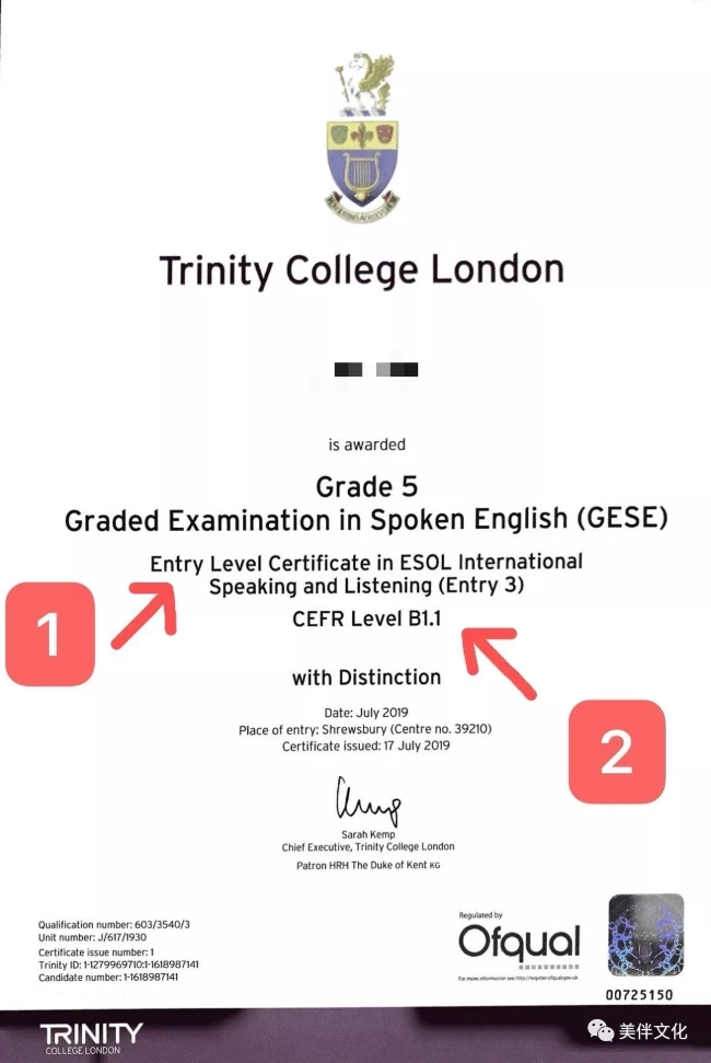 上面举例的证书是GESE 5级,对应RQF级别的Entry Level 3,所以在证书上括号里有个(Entry 3),对应CEFR级别为Level B1.1。