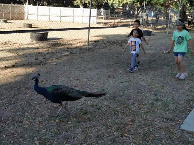 周三放学后,我们来到孔雀园。在这里,孔雀们随意溜达,孩子们跟随追逐。