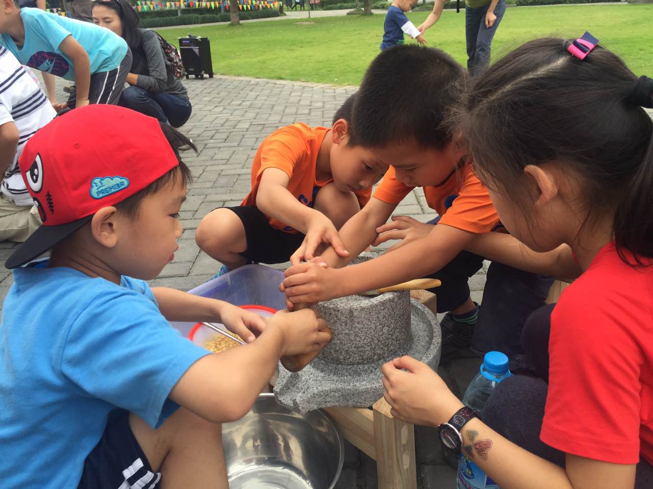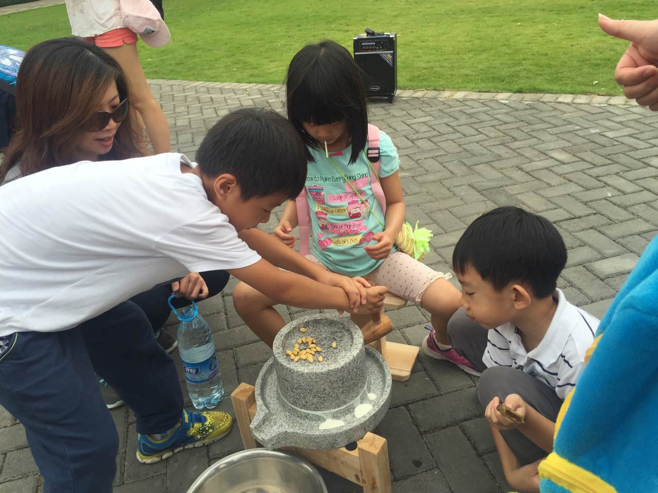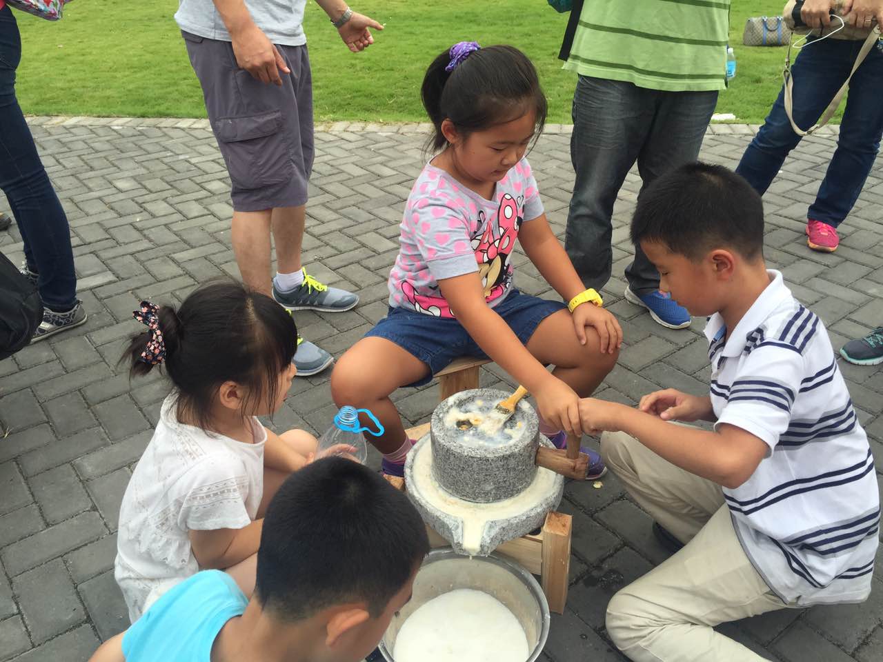 爸爸妈妈很辛苦,我们一起为他们磨豆浆。明确分工,你加豆来我转磨,大家齐心协力真能干。干杯,孩子们你们真棒!