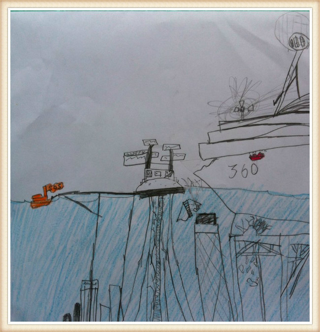 全球气候变暖使得太空针塔和附近的大楼都被海水淹没了,只剩下塔顶露在外面,像一个小岛。一艘大轮船不小心撞上塔顶,船头被撞掉了一小块,一艘救生艇载着船上的人逃生去了。