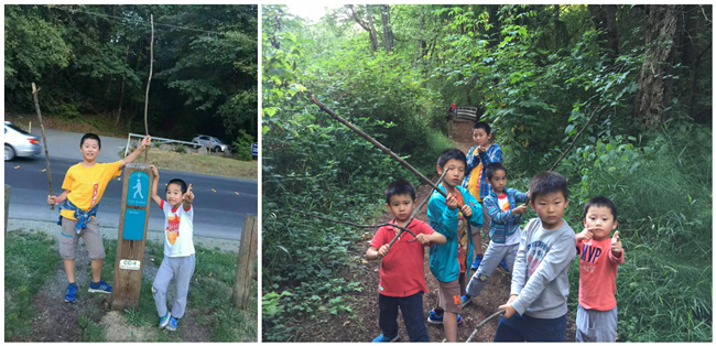 兄弟俩在森林氧吧徒步中跟其他4个美伴的小男生一起冲在最前面,成为6人组第一小分队。一路上还运用夏令营学到的知识看路标、做记号,最后率先到达终点,获得了冠军!