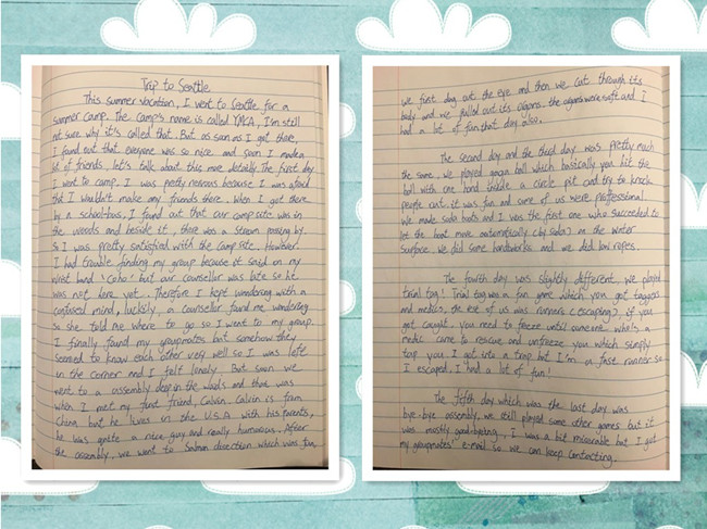 This summer I went to Seattle for a summer camp. The camp’s name is called YMCA, I’m still not sure why it’s called that. But as soon as I got there, I found that everyone was so nice and soon I made a lot of friends. Let’s talk about this more in details. The first day I went to camp, I was pretty nervous because I was afraid that I wouldn’t make any friends there. When I got there by school bus, I found that our campsite was in woods and beside it there was a stream passing by. So I was pretty satisfied with the campsite. However, I had trouble in finding my group because it was said on my wristband “Coho” but our counselor was late so he was not there yet. Therefore I kept wandering with a confused mind. Luckily another counselor found me wandering and told me where to go. I finally found my group mates but somehow they seemed to know each other very well, so I was left in the corner and I felt lonely. But soon we went to an assembly deep in the woods where I met my first friend Calvin. Calvin is from China but he lives in USA with his parents. He was quite nice and really humorous. After the assembly we went to salmon dissection which was fun. We first dug out its eye, then cut through its body and pulled out its organs. The organs were soft and I had a lot of fun. The second and the third day was pretty much the same, we played gaga ball which basically you hit the ball with one hand inside a circle pit and try to knock people out. It was fun and some of us were professional. We also made soda boats and I was the first one who succeeded to let the boat move automatically (by soda) on water surface. Then we did some handworks and low ropes. The fourth day was slightly different. We played trial tag! Trial tag was a fun game which you get taggers and medics, the rest of us are runners (escaping), if you get caught, you need to freeze until someone who’s a medic comes to rescue and unfreeze you which simply tap you. I got into a trap but I’m a fast runner so I escaped, I had a lot of fun! The fifth day which was the last day was bye-bye assembly. We still played some other games but it was mostly goodbyes. I was a bit miserable but I got my group mates’ emails so we can keep contact.