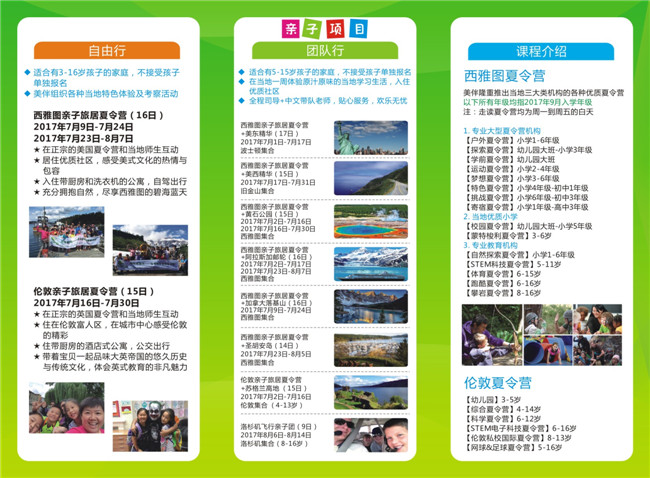 开学了,海外夏令营的报名工作也正式启动。美伴今年推出的海外夏令营涉及西雅图、洛杉矶和伦敦三地,既有单飞的寄宿夏令营,也有亲子的走读夏令营,3-18岁的孩子都能找到适合自己的优质夏令营课程。还可将夏令营与众多精彩纷呈的旅游目的地相结合,美东、美西、黄石、阿拉斯加邮轮、西雅图圣胡安岛、温哥华落基山、英格兰苏格兰,考虑好去哪了吗?2月28日之前支付定金还有早订优惠,赶快做决定吧!