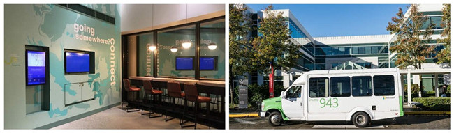 如此大的园区,当然少不了便利的通行工具。走在园区内,经常可以看到绿白色相间的穿梭巴士,员工和来访者在园区内需要车辆时,可以在任一办公楼的前台通过人工或自助预订车辆。