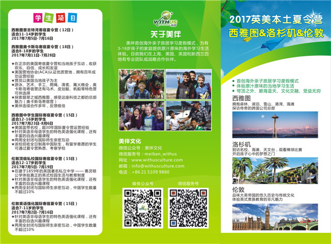 美伴专注于英美本土夏令营,孩子在夏令营的同学以当地孩子为主。今年推出的海外夏令营涉及西雅图、洛杉矶和伦敦三地,既有单飞的寄宿夏令营,也有亲子的走读夏令营,3-18岁的孩子都能找到适合自己的优质夏令营课程。还可将夏令营与众多精彩纷呈的旅游目的地相结合,美东、美西、黄石、阿拉斯加邮轮、西雅图圣胡安岛、温哥华落基山、英格兰苏格兰,考虑好去哪了吗?3月31日之前报名还有早订优惠,快点做决定吧!