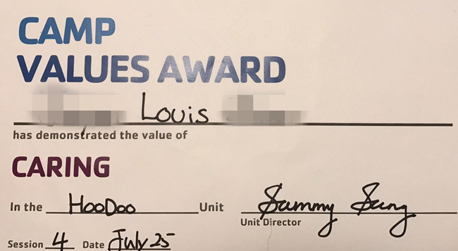 Louis因为在营地里关爱其他朋友和同学,营地特地给他颁发了特别证书!