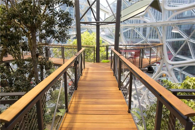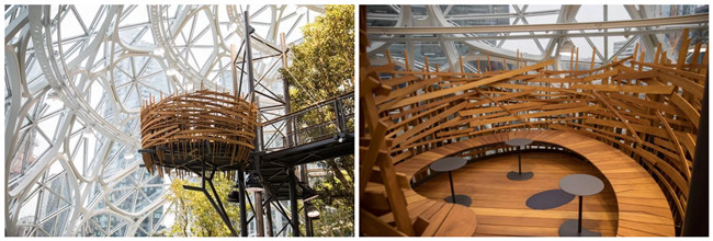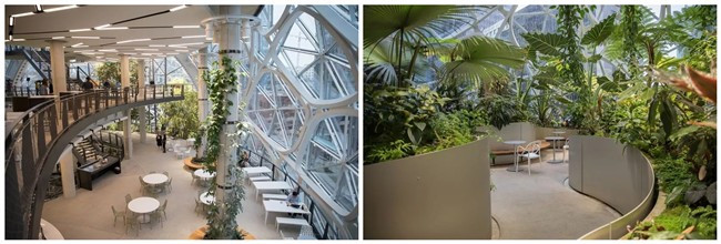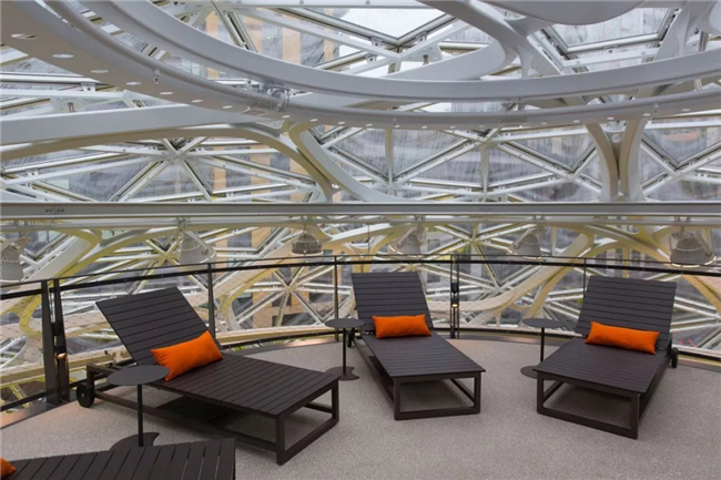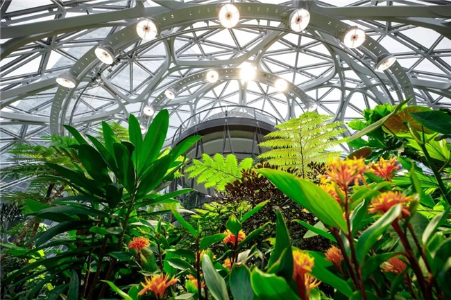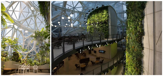 早在2013年,亚马逊就想部署一个有特色的总部办公区,次年就从美国、英国和澳大利亚等地组建了专门的养花团队,在世界各地寻觅植物,并搬到提前搭建好的大棚里养着,覆盖400多个品种,希望Amazon Spheres茂密的绿植能让员工更好地思考,激发出有创意的点子。
