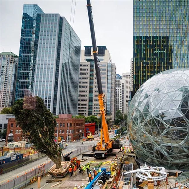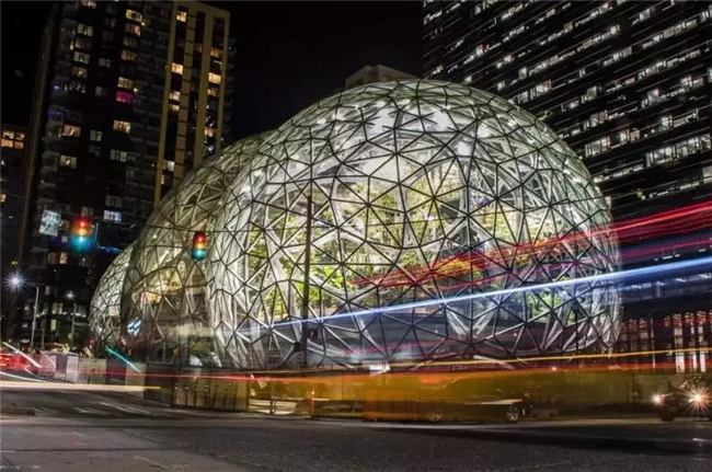 亚马逊总部整体项目占地约30万平方米,包括三座37层高的写字楼、两座中层写字楼和可容纳2000人的多功能会议厅。Amazon Spheres是最亮眼的核心建筑,由大名鼎鼎的NBBJ公司设计,三个大玻璃球组成建筑主体,最大直径39米,高27米,外墙使用了2643块玻璃面板和上千吨钢结构,充满了未来科技感,成为西雅图的新地标。