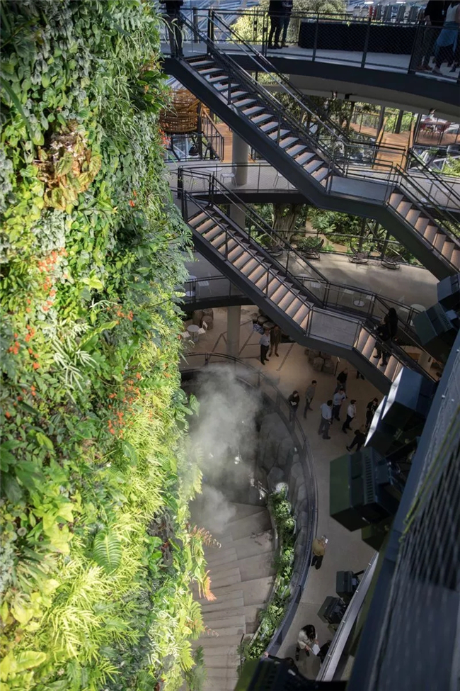 设计师团队引以为傲的绿植墙,五层楼高的“生态瀑布”,背后是一个个带细孔的小麻袋。电梯就藏在绿墙内,不过这种环境里谁还愿意乘坐电梯呢?