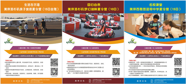 2018年暑假,美伴推出【回归自然】、【名校课堂】和【亲子旅居】三个系列的夏令营,既有学生单飞,又有亲子旅居,在西雅图、温哥华、洛杉矶、美东和英格兰都有多种选择。