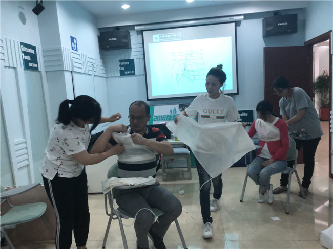 本次培训为期两天,由上海市杨浦区市东医院的吴焱医生主讲。课程内容既有通过PPT演示的知识讲解,也有各种实际操作。吴医生为大家介绍了急救程序、常见急症、突发事件的创伤急救等理论知识,接着演示了徒手心肺复苏(CPR)、除颤仪(AED)的使用、海姆立克急救法、三角包扎等。吴医生理论结合实务,授课生动有趣。他先和一位学员配合进行动作示范,全体学员再分组逐个练习,相互结对进行动作演练。
