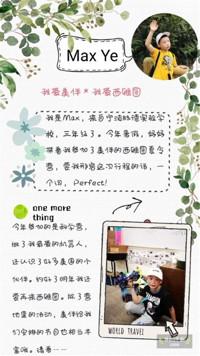 7岁的Max在西雅图参加了两周科技夏令营,他和妈妈对美伴的系列亲子课程非常喜欢!本作品由Max和妈妈联合出品——Max创意,妈妈排版。