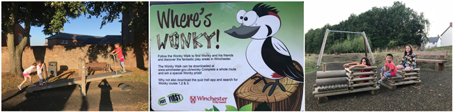 当地市政府举办了名为“Where’s WONKY”的活动,旨在引导孩子们去分布在城区各处的大大小小的公共儿童玩耍区域。一共25处,分3条路线。每到一处,可以在APP上打卡,每完成一条路线,就会有礼物。于是我们每天放学后按图索骥。所到之处各有特色,每天都有新的发现。这里的玩耍设施以木结构为主。一周打卡8处,我们也是够拼的。