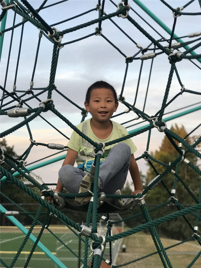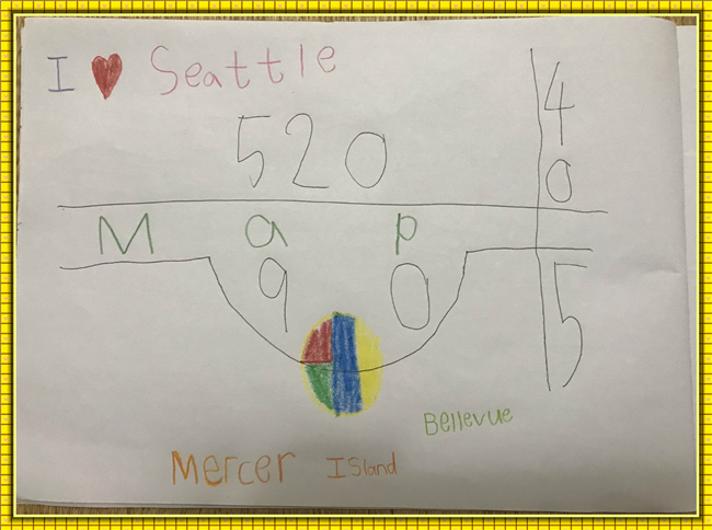 6岁的Infiniti很有方向感,随妈妈一起参加西雅图亲子夏令营的时候,经常为自驾的妈妈导航。下图是他画的西雅图导航图,贝尔维尤、美色岛以及常走的三条高速(I90、405和520)都跃然纸上。