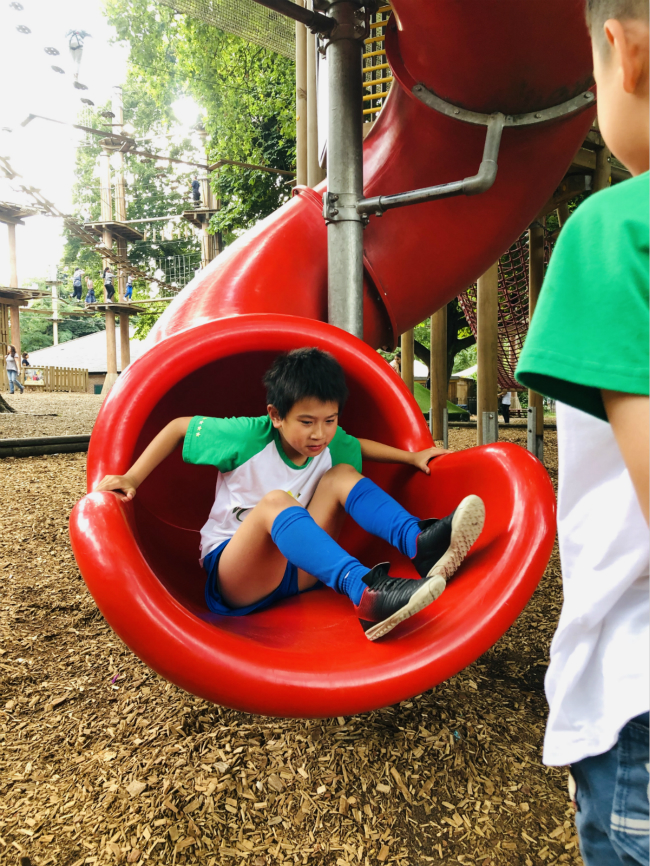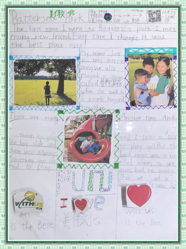 The first time I went to Battersea Park, I met many new friends. First time, I thought it was the best place ever. My mom's class was very interesting. We also played a game called 曼陀罗花. When she said 6, 6 people hugged together. There were many things to play, like big slide and there was always something you can find to play. Another time Andy and I wanted to play golf. But the bad news was it needed money to get in. We had no money. Then we found a big swing. It was so fun.