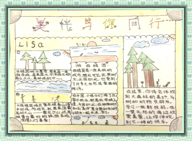 感谢您一路走来对我的帮助,在西雅图这段时光,虽然也生过气,但是我感到十分得美好。在夏令营中我学到了很多,虽然途中也有不开心的时候,但是有你们的一路陪伴,我又感到了动力,一切都会顺利进行。在爬雷尼尔雪山的时候,路程特别的远,我本来已经是累得不行了,可是又看到别的小孩还在吃力地爬着,不知怎的我突然来了劲,一口气爬到山顶途中。您不停地鼓励我们,这才使得我们有了力量。