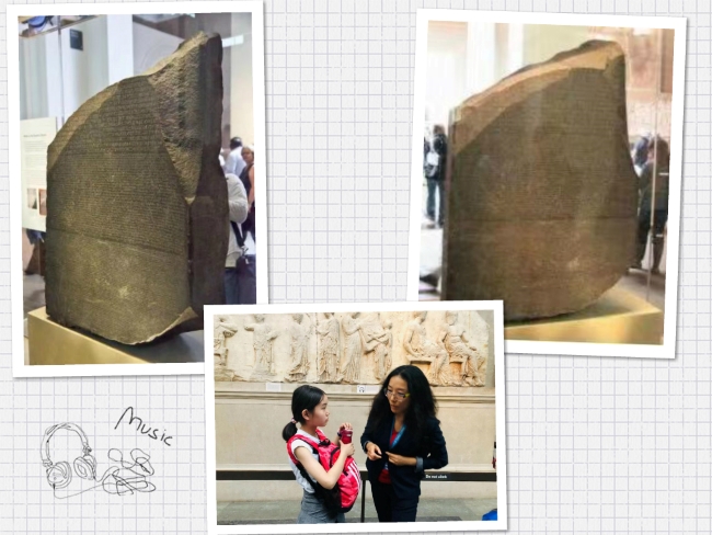 1、埃及罗赛塔石碑 The Rosetta stone 作为大英博物馆的镇馆之宝,罗赛塔石碑以古希腊文为钥匙,破译了古埃及象形文字(圣书体)和埃及世俗体。罗塞萨石碑出土于埃及港湾城市——罗赛塔,此文物在1799年被法国人皮耶·佛罕索瓦·札维耶·布夏贺发现,但在英法两国的战争中被英国人掠夺到英国,自1802年起保存于大英博物馆中并公开展示。罗赛塔石碑大约是在公元196年制作,描述的是古埃及法老托罗密五世的故事【诏书】。 2、埃及木乃伊 Mummy 在大英博物馆二楼的埃及木乃伊馆里,我们看到了木乃伊从最开始埋在沙漠里,到制作成精美到极致(如上图)的制作史,还深入了解到它是怎样从尸体变得那么精美:在法老死后,先把尸体清洗一下。为了不让尸体腐烂,制作木乃伊的人会把盐等调料灌在尸体里,腌制100天左右。再把尸体里的其他器官(如:肺)装到一个个小瓶子里,只在尸体里留下心脏。接下来的步骤就是一步步的包裹啦!再在最外面的那一层,放上特别多的金饰,简直是太漂亮啦!!!我相信所有人看了之后都会流连忘返的! 这次大英博物馆奇妙之夜非常圆满,我希望以后还能继续在大英博物馆里探索、学习知识,能更多的了解世界历史!