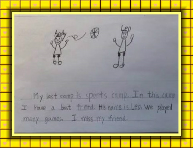My last camp is sports camp. In this camp, I have a best friend. His name is Leo. We played many games. I miss my friend.