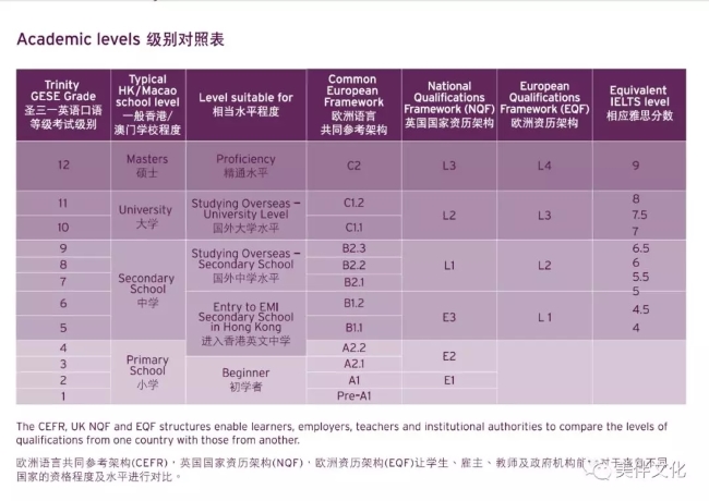 最后,来张简单易懂的对照表。国内的双语学校和国际学校也大致相当于第二列的水平。