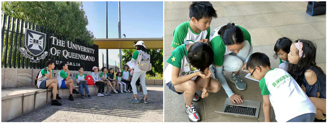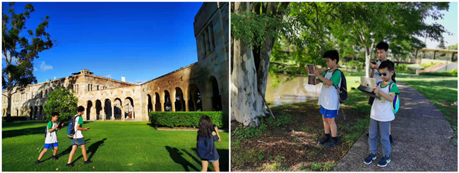大家还一起去到澳洲八大名校之一的昆士兰大学。正值假期,校园里显得特别宁静,湖里的水鸭、乌龟、鳗鱼吸引了大家的注意力,大家一边欣赏美丽的校园,一边赞叹这里的生态结构。当美伴老师把大家带到大学的核心地带时,大家都惊呼好美啊!在老师的提示下,大家用各种软件制作视频,记录下了各自眼中的昆大,希望这些美景能留在孩子们的心中,唤起他们对大学生活的向往。