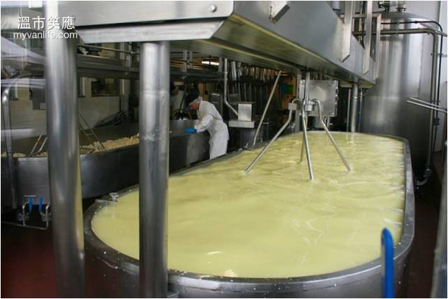 这家起司店的面积不大,硬是将室内面积隔出1/3出来作为起司制造工厂供游客观赏。每当诺大的水池注满牛奶,机器手臂缓缓搅动,总能激起隔窗观看的惊呼声此起彼落。