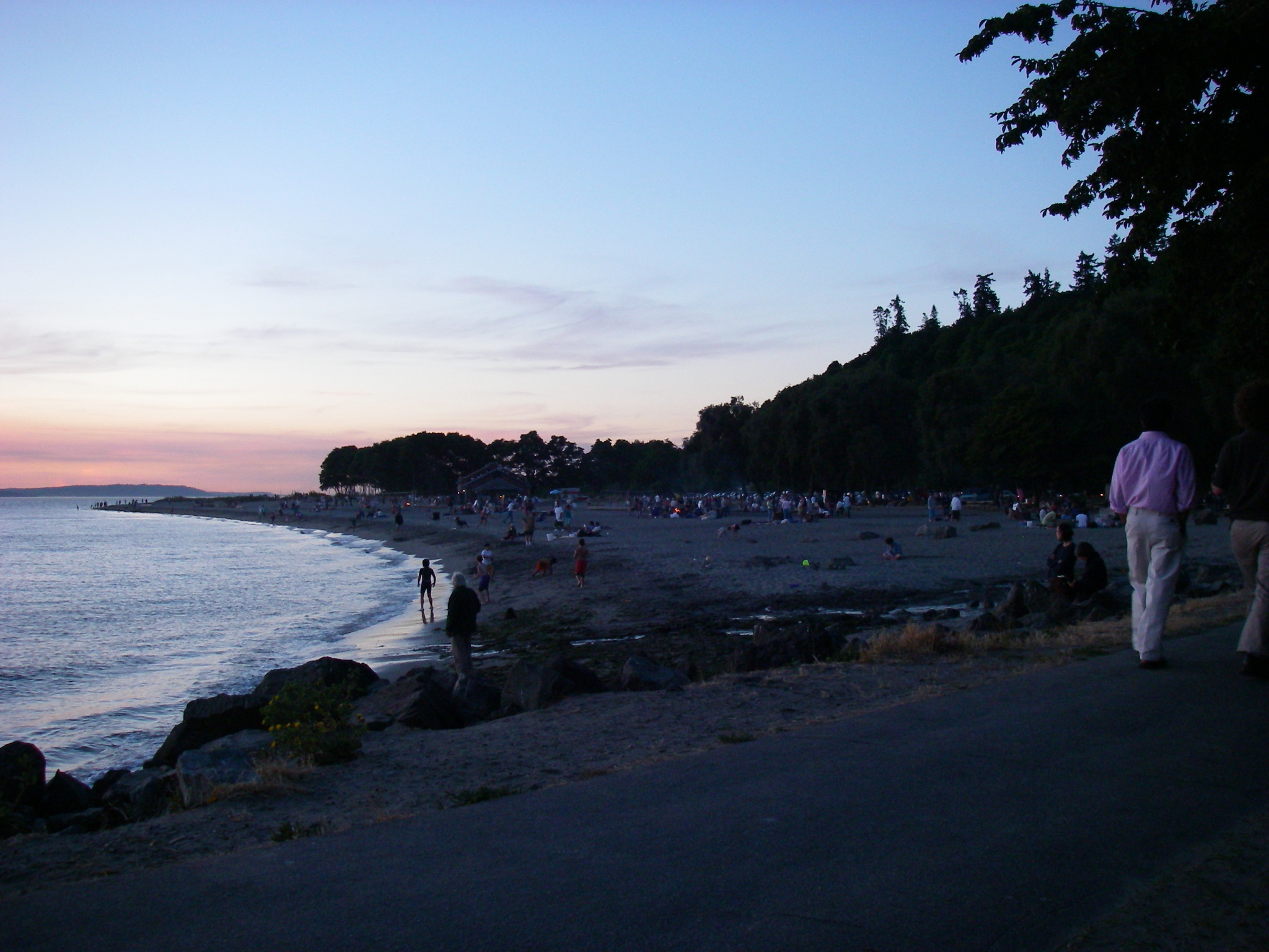 从金色花园这个市区西北部的海滩望去,奥林匹克群山(Olympic Mountains)在夕阳的掩映下,如剪纸一般,轮廓分明。若是夏天午后来,那可得早点出发,否则光停车可就折腾个够。此外,这里也有公共浴室,不过由于都是泥沙,感觉有点脏脏的。