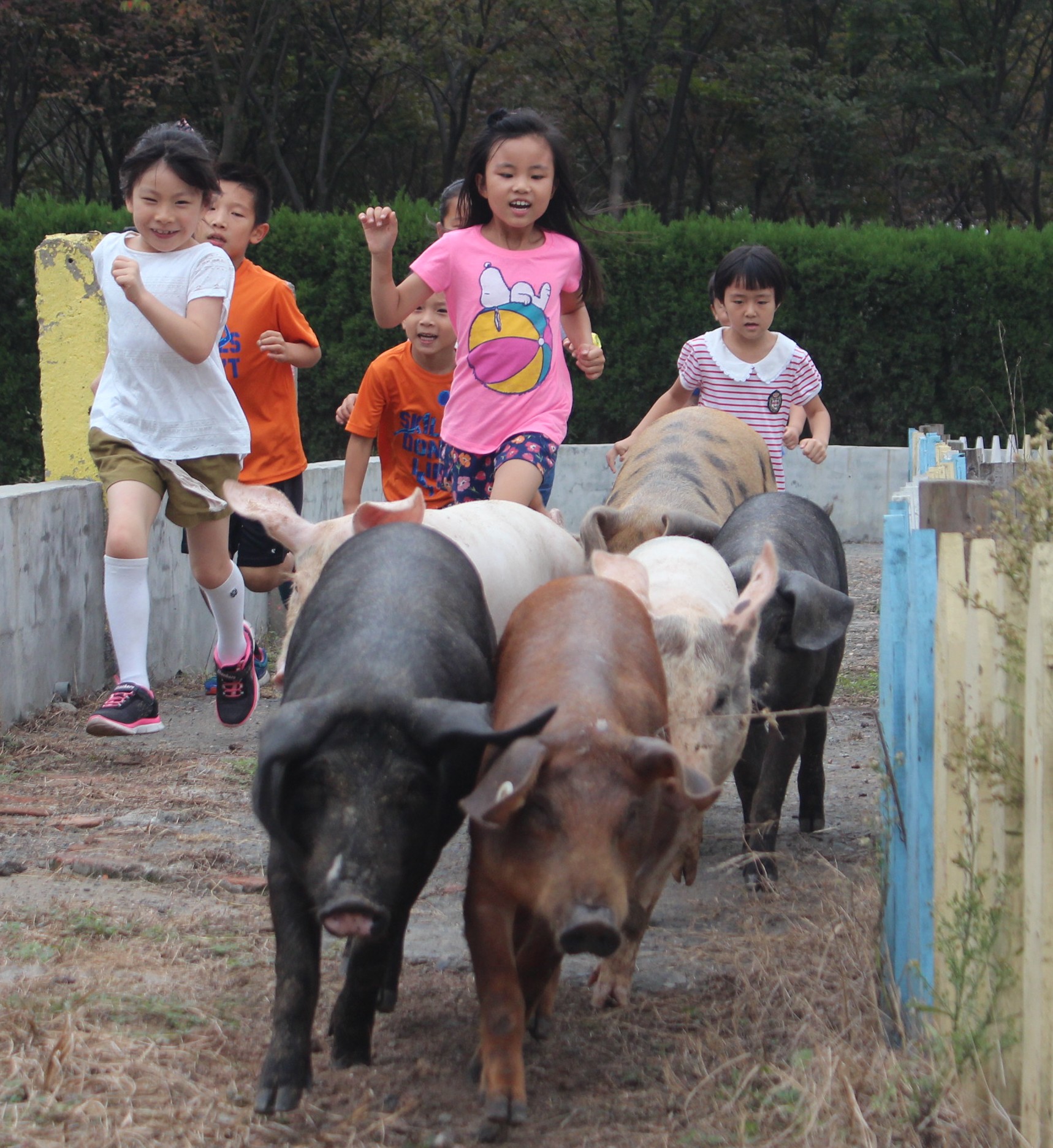 快乐的一天,少不了你们的笑语欢歌,无论是在大巴上,还是农庄里。先来看看有趣的动物表演,疯狂的小猪和小朋友一起赛跑,激烈火爆的山羊顶角,尽情的喂鸵鸟的孩子们,当然少不了释放能量的攀爬架。