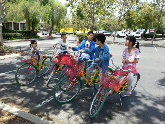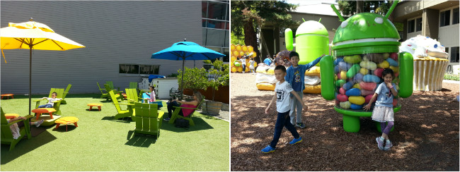 因为飞机上吃的不错睡的也不错,落地后孩子们都生龙活虎,一点也看不出时差的影响。于是大家立刻去硅谷参观了Google的办公园区。深不可测的Google办公楼都只有三、四层高,也没有院墙围阻,一点也不像富可敌国的高科技公司。休息区五颜六色的,还有安卓儿童乐园,更像是温暖休闲的公园,真正的以人为本,扁平化世界。Kiki妈妈对孩子感慨,Google是世界上最伟大的公司之一,因为他们的发明创造改善了成千上万人的生活!