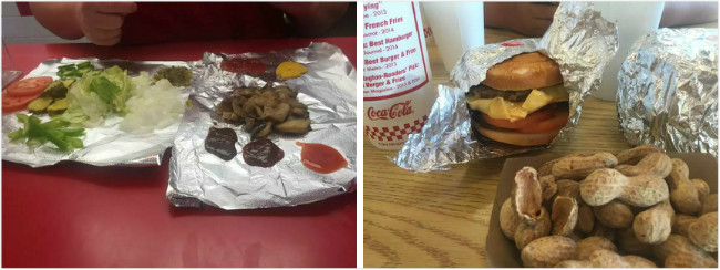 推荐非常友好的一家连锁汉堡店——FIVE GUYS,夏令营旁就有一家。为了让我们这三个中国人明白选项,店员不厌其烦的把全部食材都展示在锡纸上,让我们尽情挑选。新鲜的牛肉,标明产地的土豆,原始的薯条,yum yum!