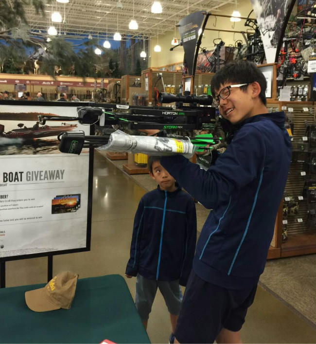 参观枪店,哥哥瞄准,弟弟羡慕。