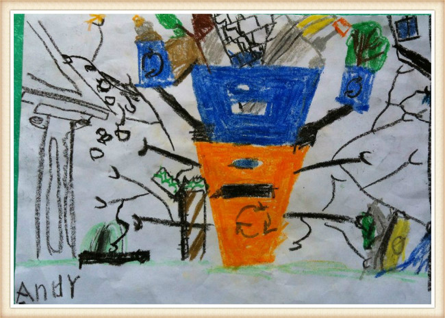 有感于美国良好的回收理念,我也要设计一个机器人垃圾桶。它可以有很多手臂,能把树枝、水管、碎片等各种垃圾统统抓到肚子里消灭掉。