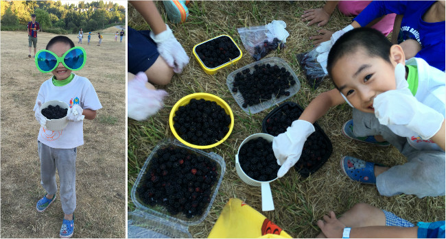 在跟美伴小伙伴们的摘黑莓比赛中,弟弟摘的黑莓又多又大又黑,赢得了摘黑莓冠军的称号,这幅超酷的大眼镜是冠军的奖品哦!