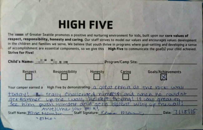 弟弟还因为在夏令营爬墙任务中迎难而上挑战自我得到一封表扬信。