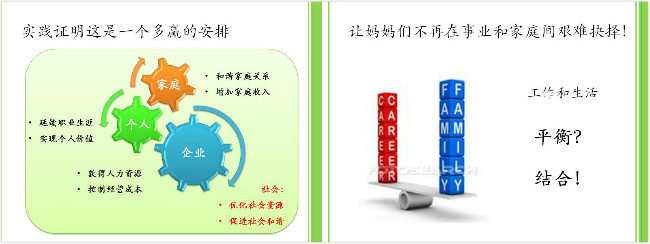 冉晶分享道:“有一次在跟员工的见面会上,有人问马云他是怎么做到工作和生活平衡的。马云一本正经跟大家讲生活和工作是可以平衡的,越讲心里越不对劲,晚上回到家他跟大家道歉,他承认说了假话,因为他没平衡,工作和生活不可能平衡。他认为要把工作和生活融为一体,并学会从中寻找快乐。我以前康宁的COO几乎说过一模一样的话,工作和生活不可能balance,只能integrate,就是结合、融合。我们美伴文化,虽然还是个年轻的创业公司,但我们清楚我们的使命——除了给亲子家庭带来高质量的教育文化产品外,还要提供给妈妈们工作和生活结合的机会,让有职业理想的妈妈们不必在事业和家庭间艰难抉择!”
