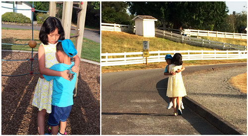 两个宝贝相亲相爱互相关心,弟弟难过了,姐姐一定会抛开其他事情来照顾呵护弟弟,伙伴们都称他们为最佳姐弟!